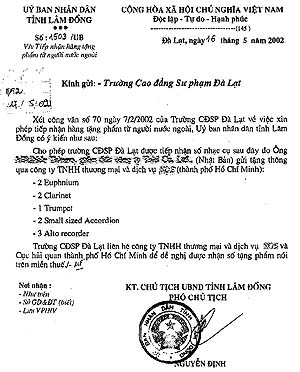 師範短大の備品となるわけですので、贈答者の氏名住所職業等を明記した書類が欲しいとのことでした。お手数ですが、事前に適当な贈答趣意書みたいなものを簡単に作ってもらえませんか? 英文であればベターですが、日本文でも結構です。その場合はベトナム語に訳し、送り返しますので、署名の上ご返送ください。